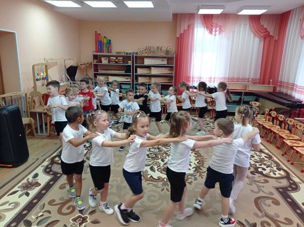- Игры на ритм и мелодию, пение простых песен, танцевальные паузы.